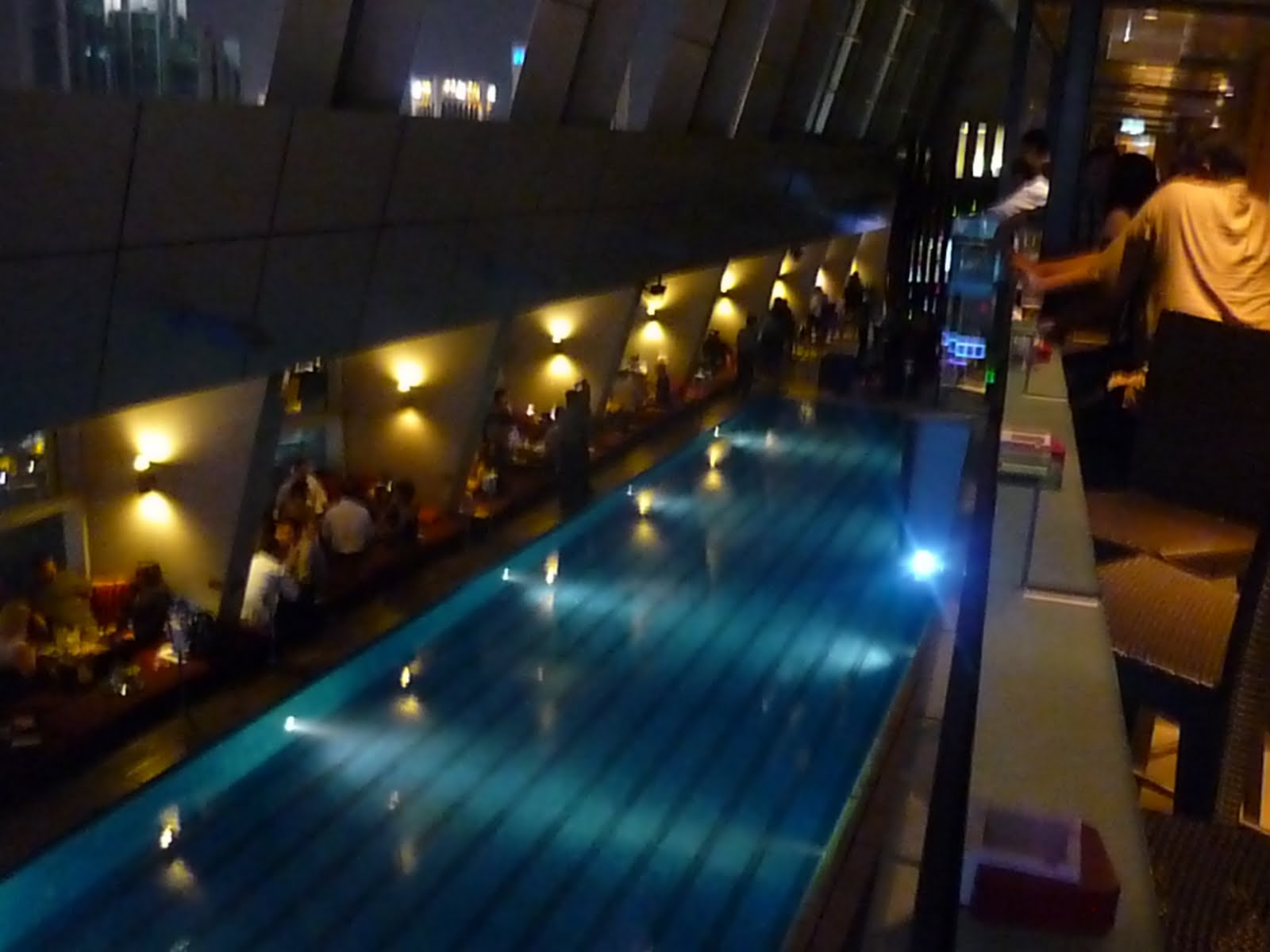 So, how to describe Skybar? Well, for starters it has ‘THE’ view that you’d want to have if you were going to celebrate the main transition! Located on the top floor of the Traders Hotel overlooking KLCC park and the iconic Petronas Towers, it obviously had the view but also had prime position for the fireworks that were going to be let loose at midnight. Right in the centre of what can really be classified as a large atrium is a lap pool, and truthfully, even prior to seeing it I kind of already knew that my destiny would be to end up in the drink sometime after midnight…but that’s a story for later. Along one side of the pool is a none too wide walkway that provides access to the sunken lounges and large bay windows that in turn provide a fantastic outlook onto the park. The far end of the room is where the main bar is located, and scattered around the pheriphery of the pool on the side opposite the main outlook are lounges, bar stools/tables etc. We walked in in order to try and scope a suitable position for the evening but realised quick smart that most of the tables and lounge seating had been booked out and that come 9 or 10pm getting into this place would be near impossible to get into. Having a drink and questioning the bar staff as to availability we found that the upper deck/balcony above the pool was being opened up and that tables there could be reserved…for a price…from what we were told, it was a requirement to purchase two bottles of ‘something’ from their menu in order to confirm your place. To me personally this was a no brainer, if you’re going to be drinking on NYE then why the hell not order in advance. Of course the NYE menu was overpriced but you were locking yourself in to some prime real estate for the festivities. I don’t think it took Frichot too long to make up his mind either, as a few mins later we were advance ordering our vodka and champagne and having it explained that all mixers were included and being briefed on the names of our personal wait staff for the night. ‘Oh Yeah’, it was sounding like we had the plan and it was taking effect. I did also quiz our man as to how many people would 'per chance' end up in the pool during the evening and his comment was, ‘there’s always someone’ …yes my man, isn’t that the case…remember my face bro’, you’ll be fishing me out sometime after 12!